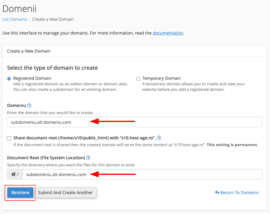 La Document Root (File System Location) se completează automat numele sub.domeniului care va fi un folder în rădăcina contului ) înainte de public_html) unde veți încărca conținutul acestui subdomeniu.