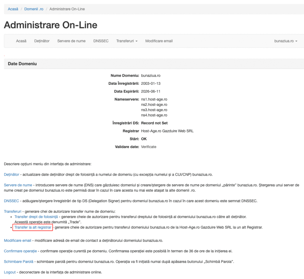 3. În prima pagină după autentificare, dă clic pe link-ul Transfer la alt registrar.
