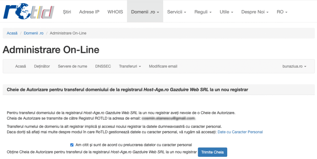 5. Acum veți primi cheia de transfer la alt registrar pe adresa de email cu care domeniul este înregistrat și puteți face transferul din pagina Transfer domenii.