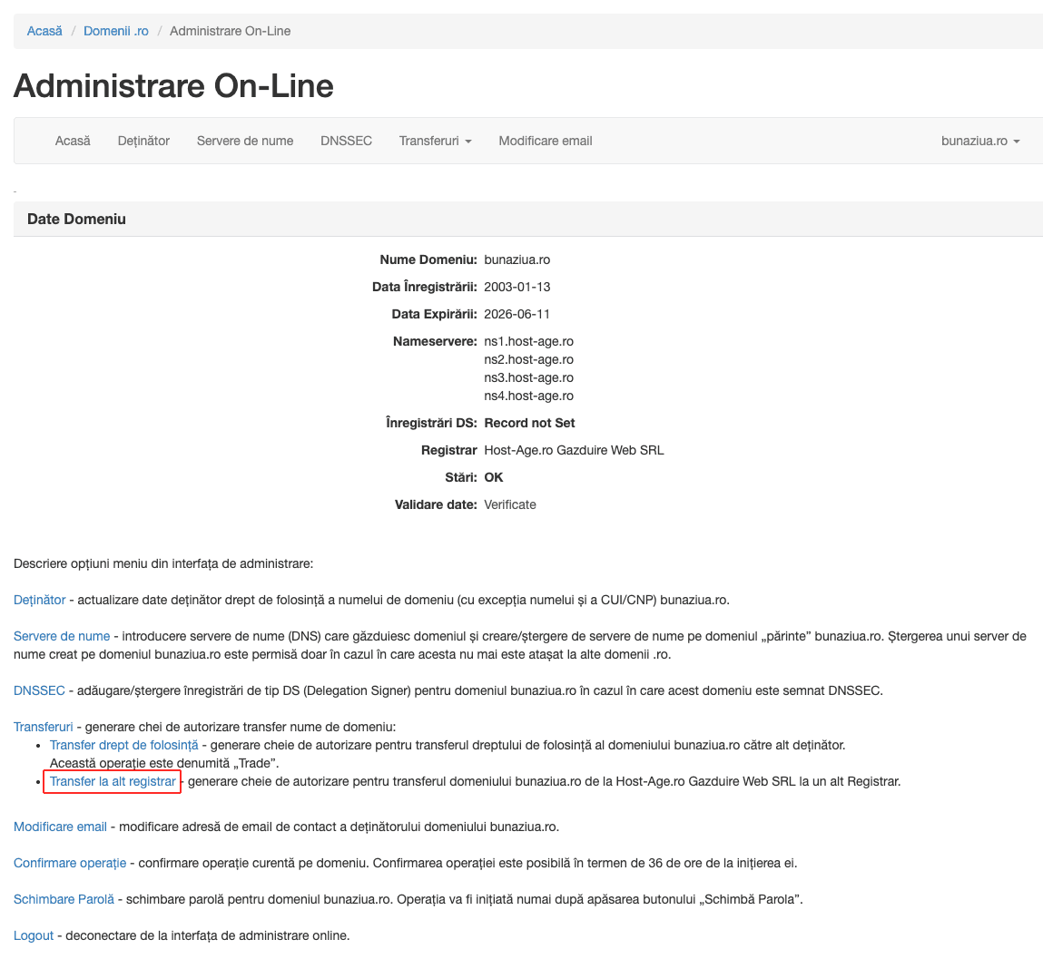 3. În prima pagină după autentificare, dă clic pe link-ul Transfer la alt registrar.