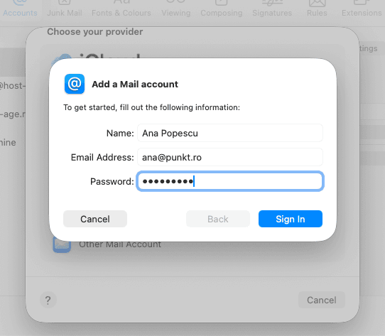 După ce ai creat o adresă de e-mail cu ajutorul butonului Conturi de E-mail din cPanel, urmărește instrucțiunile de mai jos pentru a configura contul de e-mail în Apple Mail.