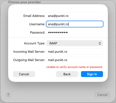 4. Completează Email Address cu adresa întreagă de e-mail, Password cu parola contului de e-mail. La Account Type selectează IMAP (Recomandat) sau POP3. La Incoming Mail Server și Outgoing Mail Server scrie mail.domeniul-tau.ro. Apasă butonul Sign In.