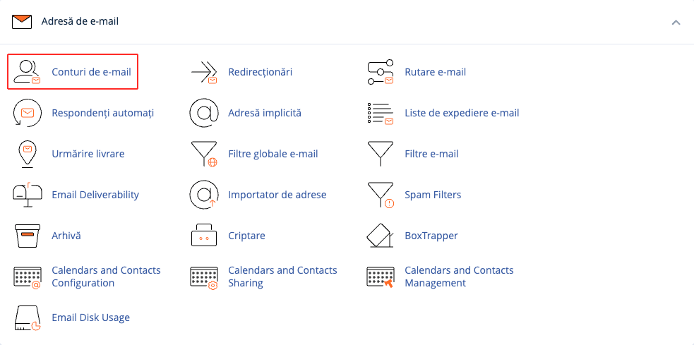 Pentru a modifica parola unui cont de e-mail trebuie să accesezi cPanel la adresa cpanel.domeniul-tau.ro apoi clic pe butonul Adrese de e-mail