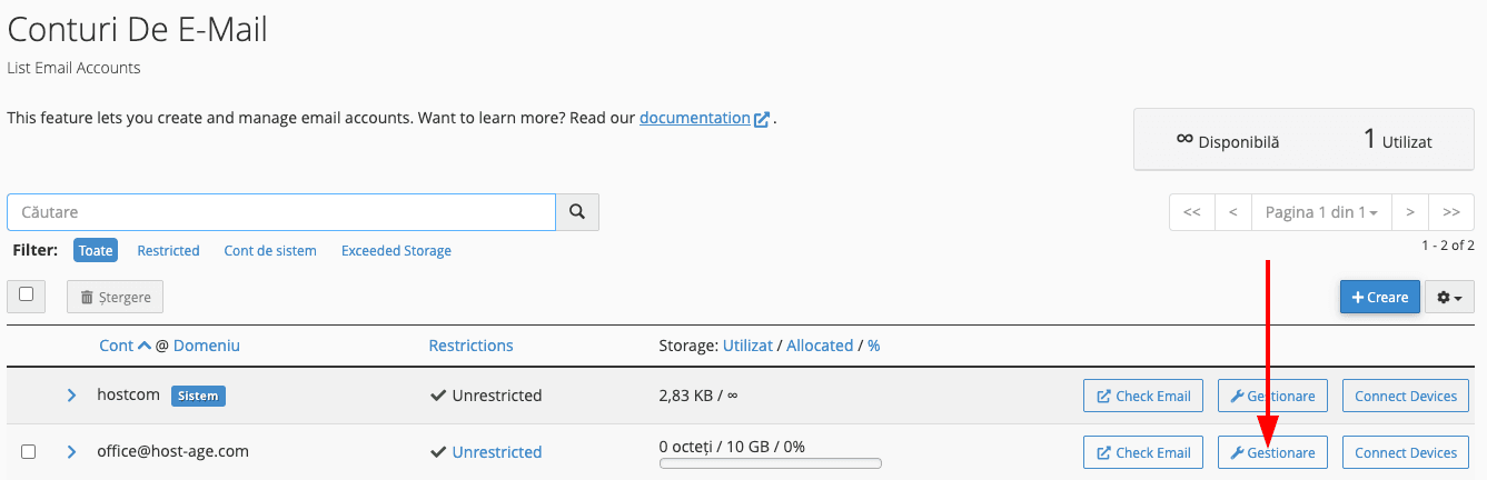 Clic pe butonul Gestionare din dreptul adresei de e-mail pentru care vrei modificarea parolei